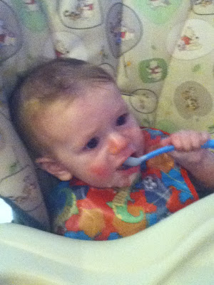 After he eats, we sometimes let him explore his bowl and spoon... well, yesterday he picked up his bowl and dropped it right on his head!  Good thing it was empty! :)